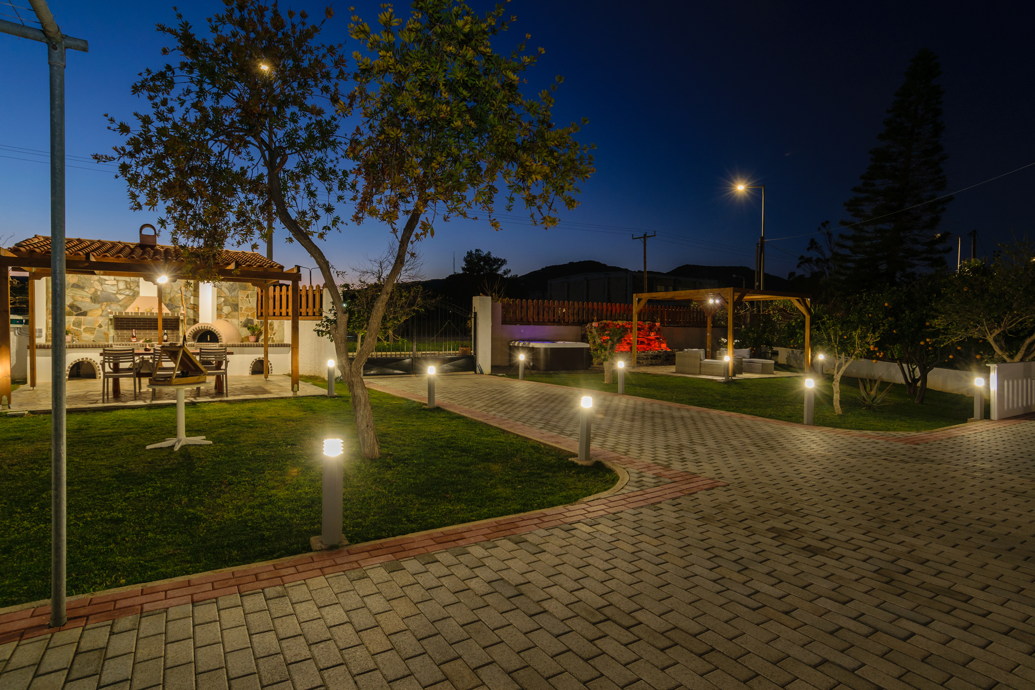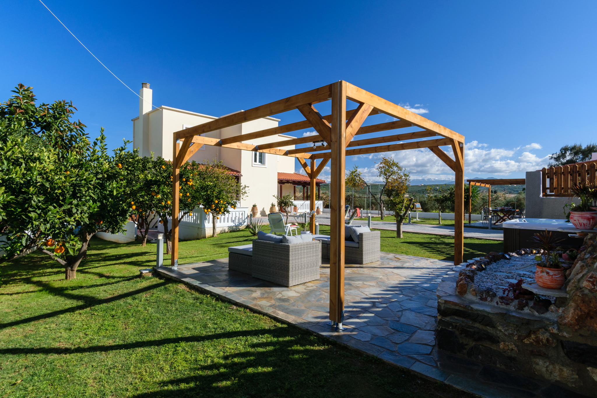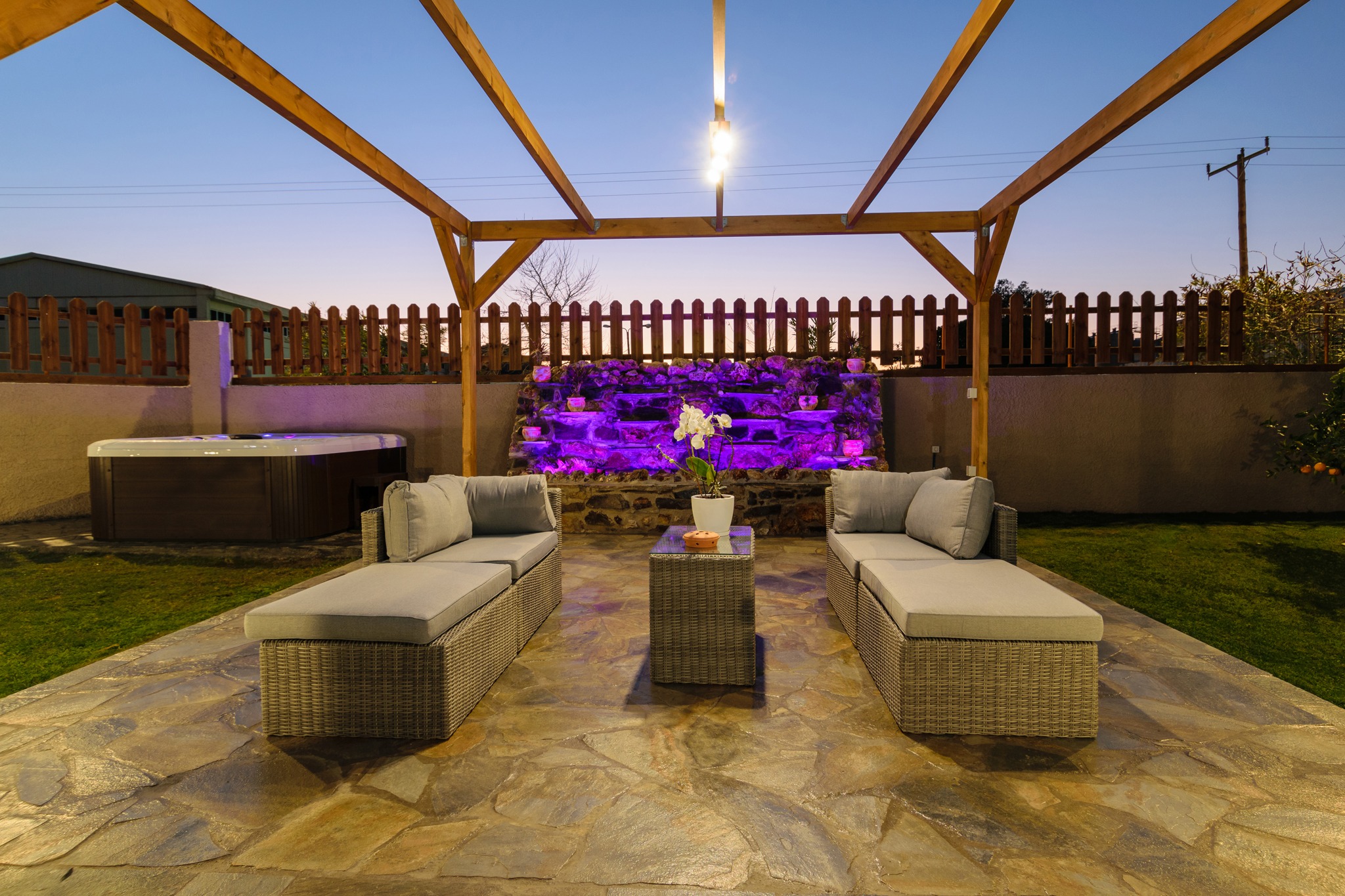 A wooden pergola with a natural stone patio is located next to the orange grove. There, you can find comfortable sofas for some, relaxing, romantic or family evenings, enhanced with falling water sounds from the unique stone made waterfall.